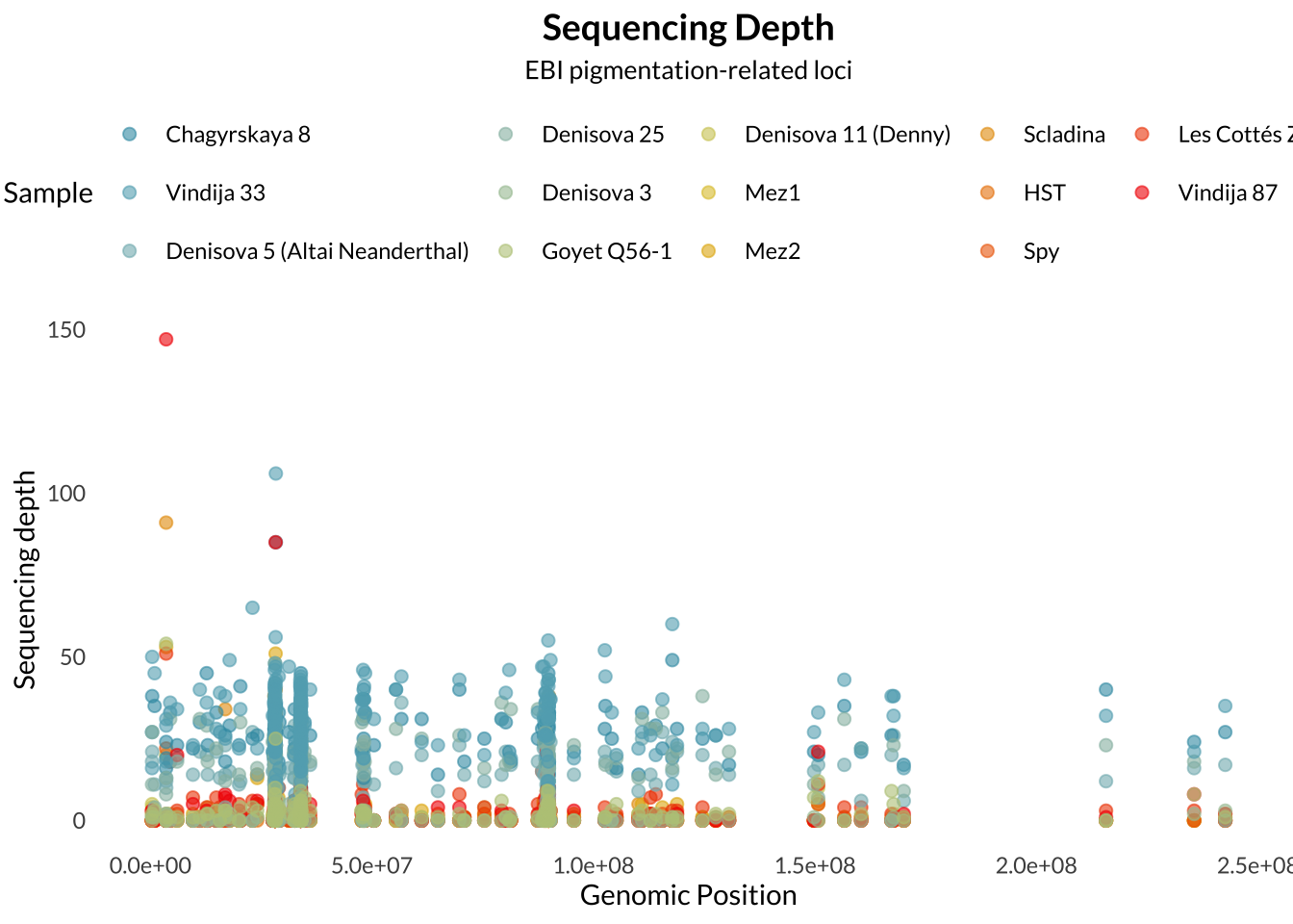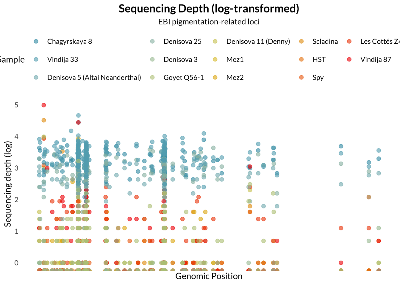 Sequencing read alignments were processed using samtools. The input BAM file was first indexed, then coordinate-sorted and re-indexed to ensure compatibility with downstream analyses. Read depth was calculated for archaic samples at the specified pigmentation-related SNP panel using samtools depth including sites with zero coverage.