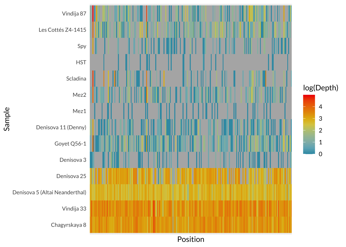 These genomes make direct archaic pigmentation analyses possible, but only in the manner of descriptions and comparisons. This limited dataset does not provide enough statistical power to make claims about the full pigmentation range of Neanderthals or Denisovans as groups. This motivates the aim of this study to provide a locus-level catalog of pigmentation-associated SNPs in available archaic genomes, and then compare those with variation in diverse modern humans. In order to examine patterns of missingness, I created a heatmap of where sequencing depth = 0.