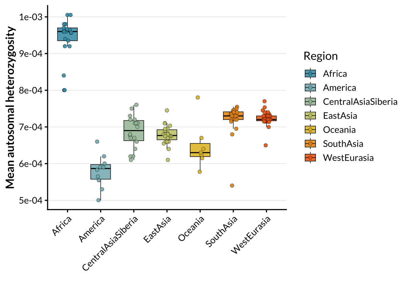 Regional distributions of autosomal heterozygosity in SGDP regions. Boxplots show population-level means, with individual populations overlaid as points. African populations exhibit the highest levels of genetic diversity, with reduced heterozygosity observed in non-African regions, consistent with serial founder effects during human expansion out of Africa.
