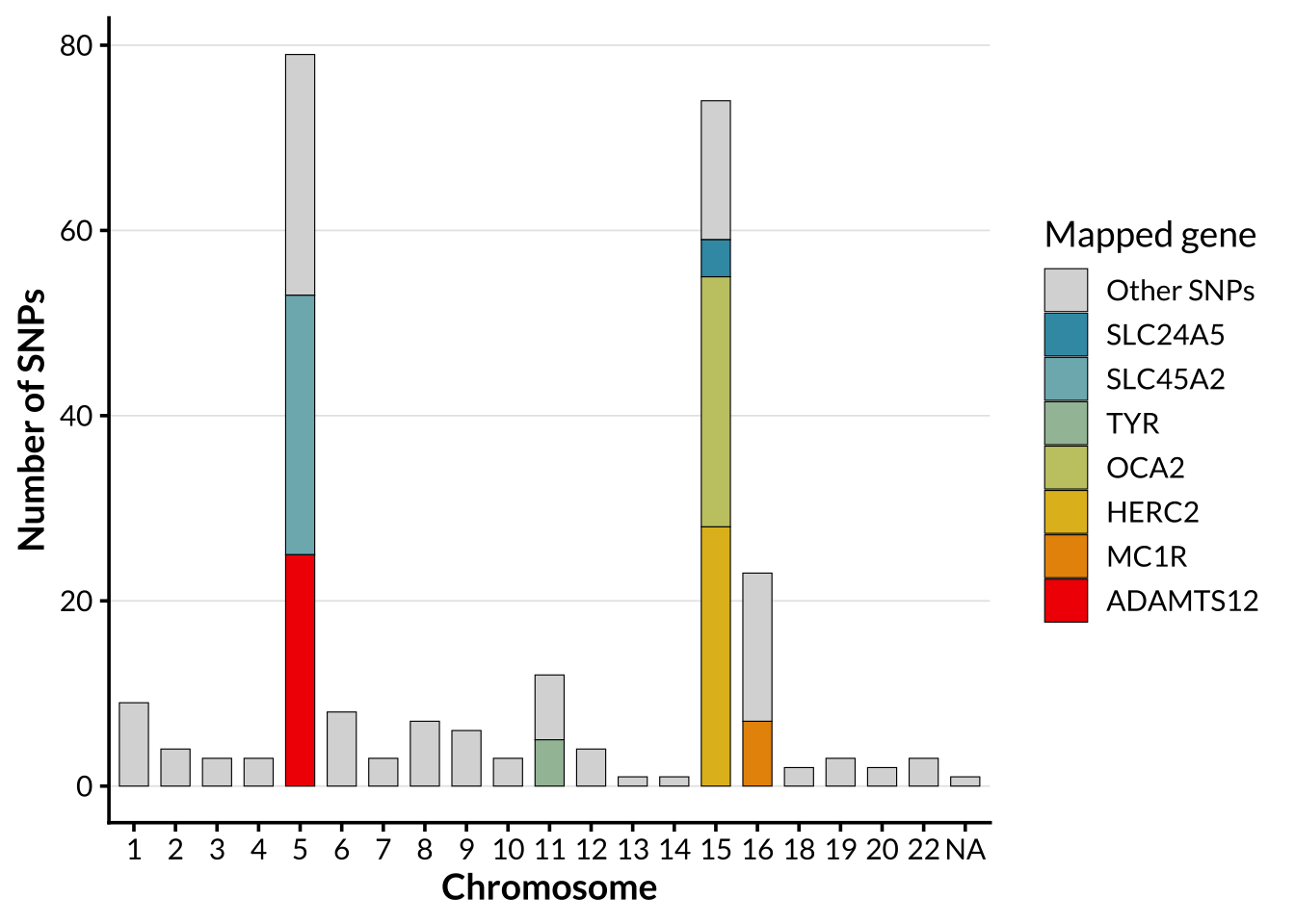 The genetic architecture of human pigmentation is highly polygenic, involving many loci that contribute to variation in skin, hair, and eye color (E. Quillen et al., 2018). Genome-wide association studies have identified hundreds of single-nucleotide polymorphisms (SNPs) associated with pigmentation phenotypes. Many of these variants lie in genes involved in melanogenesis, melanosome biogenesis, melanosomal transport, or regulation of melanocyte signaling, including SLC45A2 (chr5), ADAMTS12 (chr5), TYR (chr11), SLC24A5 (chr15), OCA2 (chr15), HERC2 (chr15), and MC1R (chr16) (Sturm, 2009). The distribution of pigmentation associated SNPs across the genome is not uniform.